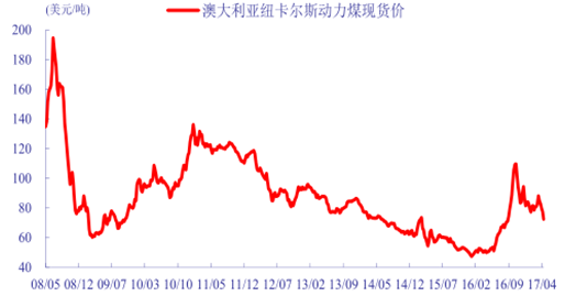 国际煤价下跌。2017 年4月28日,澳大利亚纽卡斯尔港动力煤价格报价79.83 美元/吨,月环比下调 3.2%,同比上涨 59.8%。